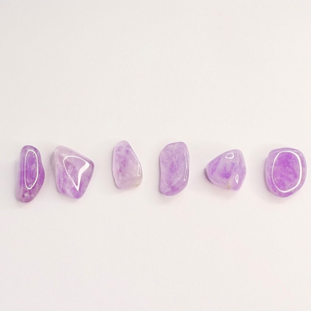 アメジストのタンブル6個セット 商品名:アメジスト タンブル 6個セット 魅惑的なアメジストタンブルの6個セットは、心に安らぎをもたらす美しい天然石です。このアメジストは、ストレスを軽減し、心のバランスを整える力があると言われています。また、独特の紫色が空間を華やかに演出し、インテリアとしても素晴らしい存在感を持っています。お部屋やオフィスに置くことで、自然のエネルギーを感じることができます。 3枚目の写真はクリスタルグリッドに乗せた時のサイズを見る為のものです。アメジストタンブル以外のものは含まれません。 ■サイズ 大きさ 約20㎜~30㎜程度 重さ 約49.5g(6個セットで) ■素材 選りすぐりの高品質なアメジストを使用しています。 ■お手入れ/取り扱い注意事項 長くご愛用いただくためには、湿気や直射日光を避けて保管してください。お手入れの際は、柔らかい布で優しく拭いていただくことで、美しさを保つことができます。また、アメジストのエネルギーを引き出すためには、定期的な浄化をおすすめします。 ■発送・注文に関する情報や注意事項 ご注文後、通常5営業日以内に発送いたします。配送手続きの詳細は、注文確認メールにてお知らせいたしますので、安心してお待ちください。配送状況についてのご質問にも迅速にお応えいたします。 ■その他の情報や注意事項 天然石のため、色や形状には個体差がありますが、その違いこそが魅力の一部です。また、欠けやヒビ、傷が見受けられる場合がありますが、アメジストのユニークな個性をお楽しみいただければ幸いです。特別な一点物として、お客様のお手元に届くことを心より楽しみにしております。 ショップのお問合せから、ご質問やご要望をお気軽にどうぞ!