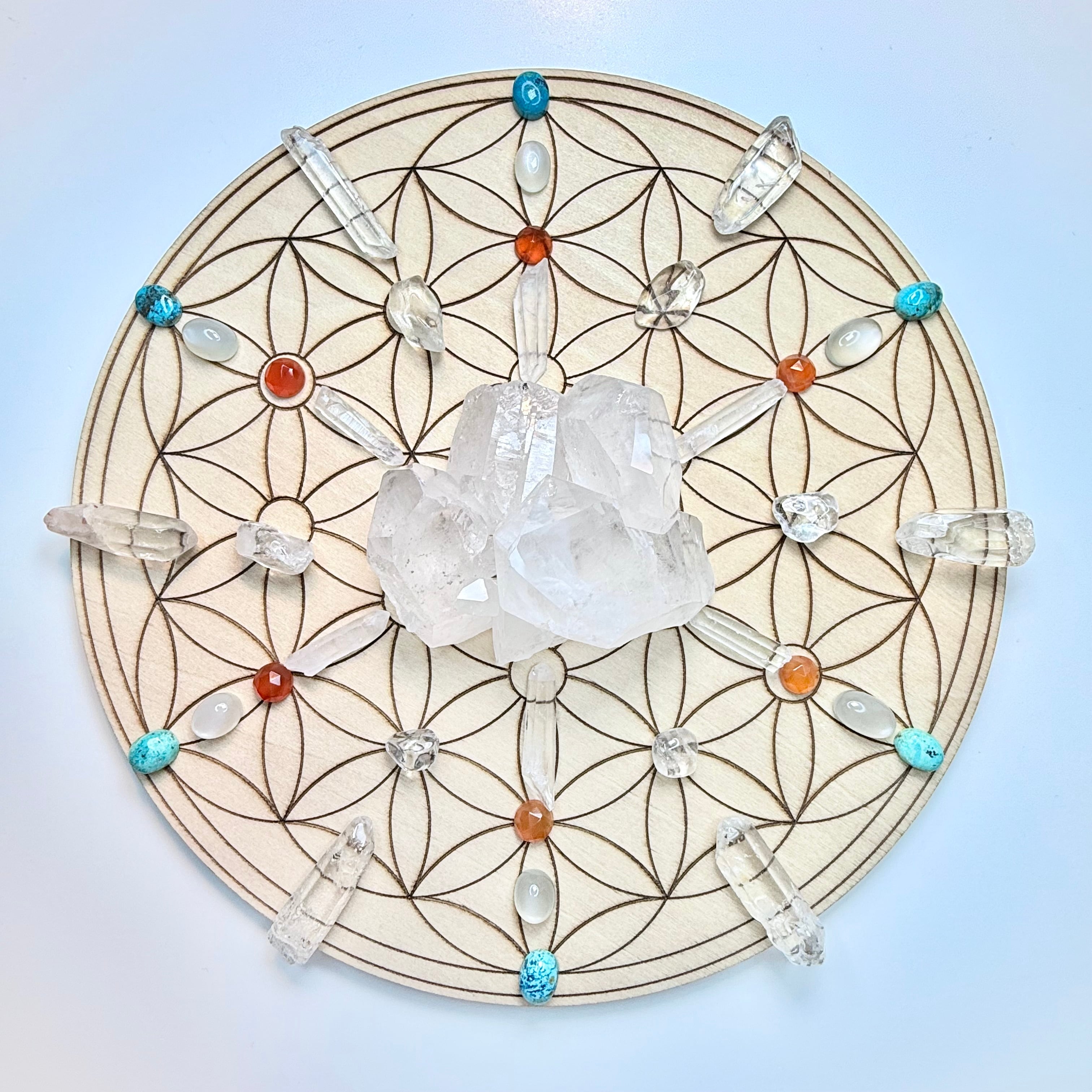 5枚目の写真は、クリスタルグリッドに載せた時のサイズ感を見る為のものです。(プレートサイズ約20㎝) 水晶クラスター以外のものは含まれません。