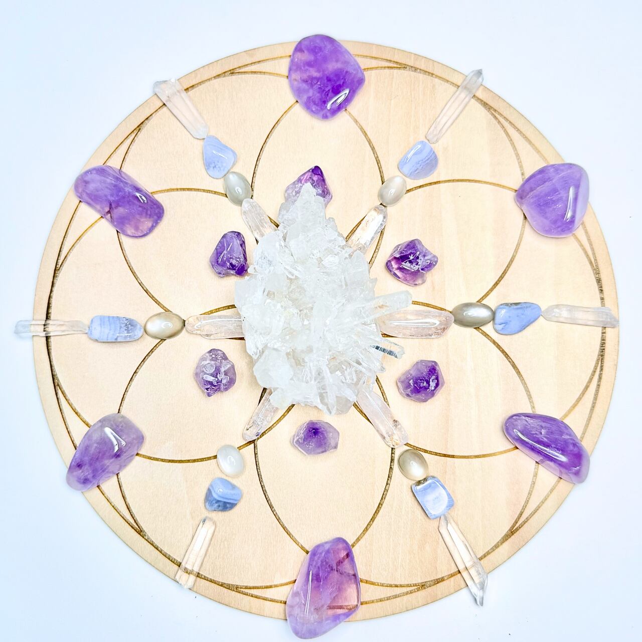 4枚目の写真はクリスタルグリッドに乗せた時のサイズ感を見る為のものです。水晶クラスター以外のものは含まれません。(プレート約20㎝)