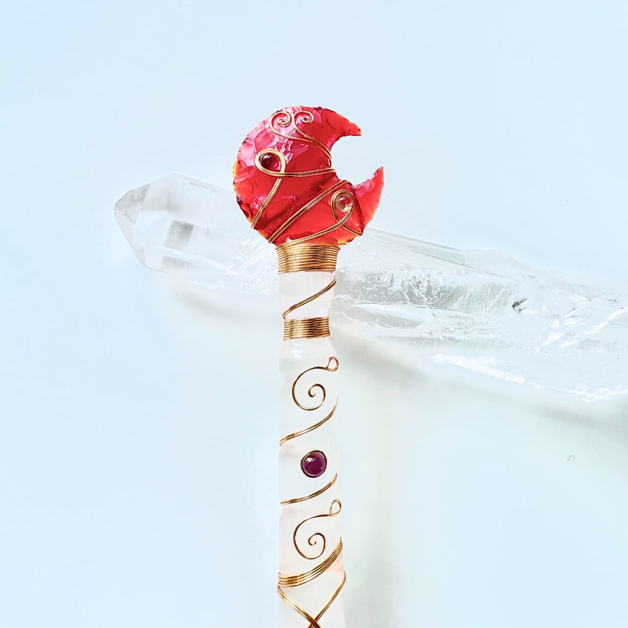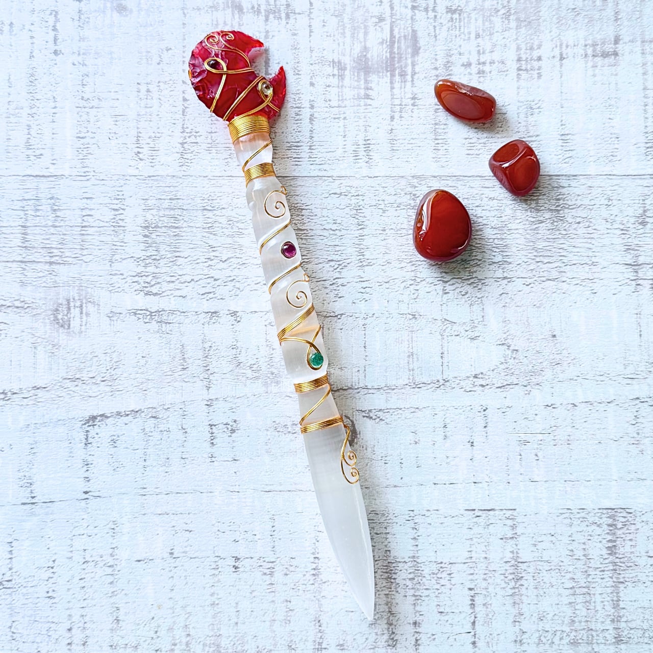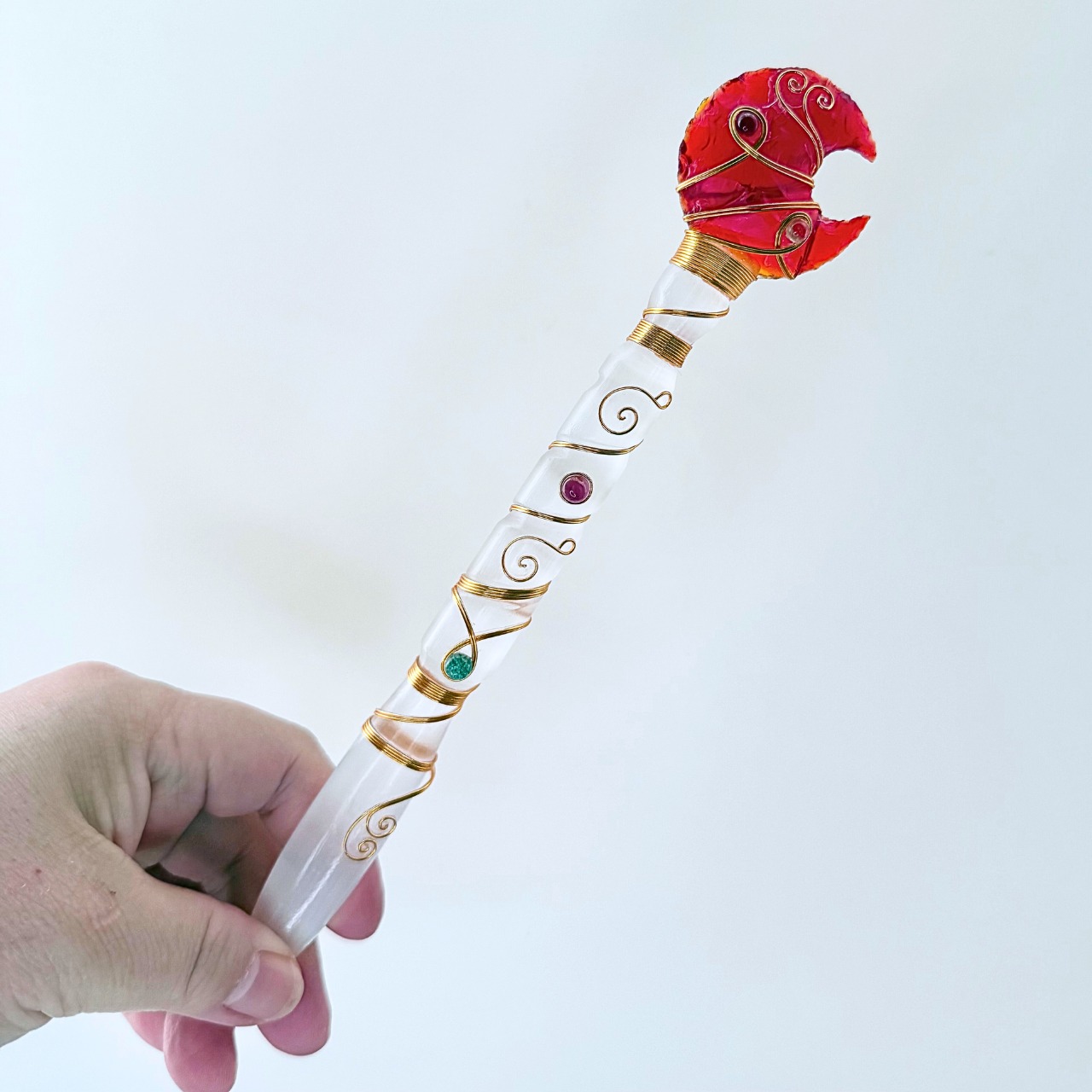 セレナイトとレッドカーネリアンの波動が交錯することで、心に活力と安定感をもたらします。このワンドは、あなたが直感を信じ、自分を表現するためのパートナーとして輝きます。