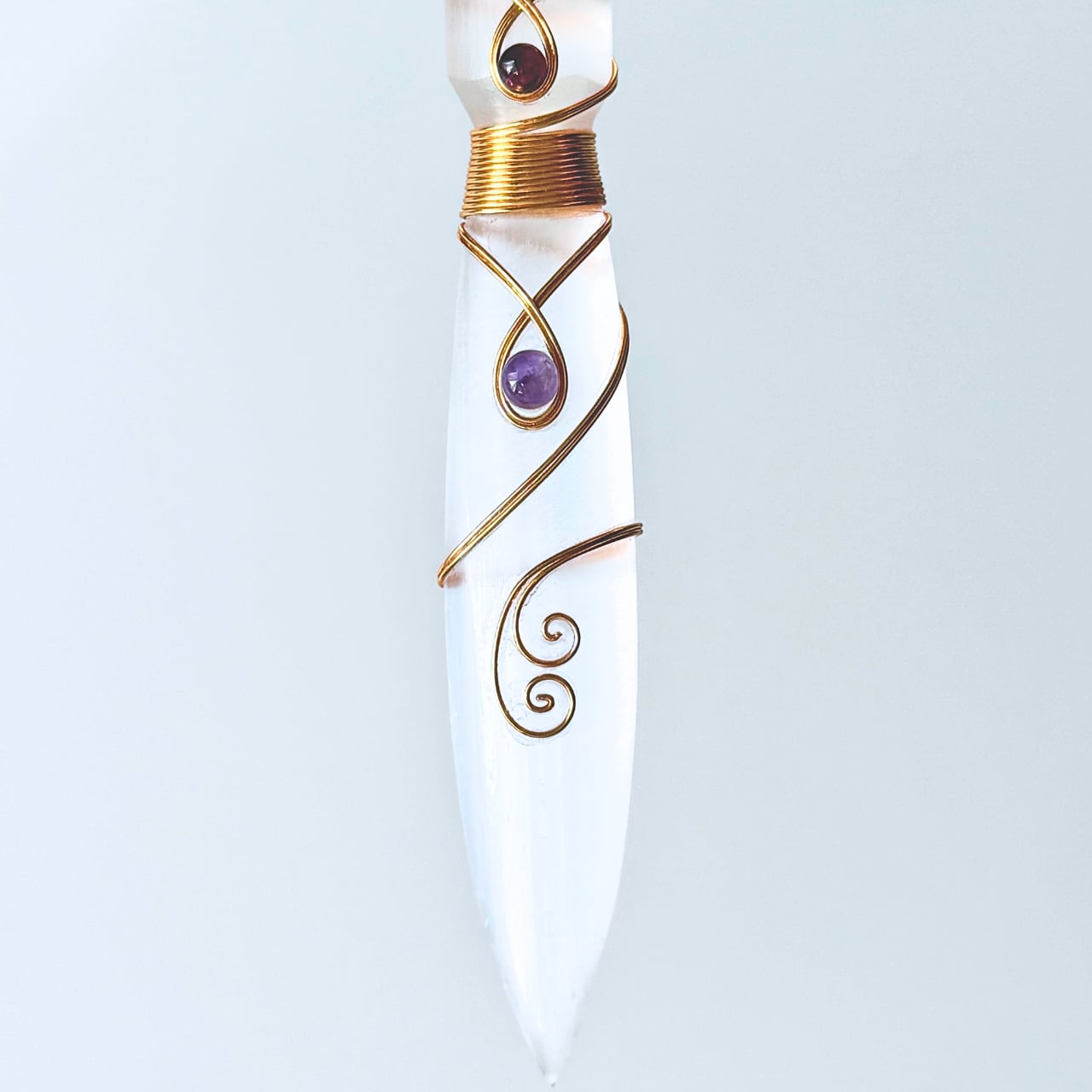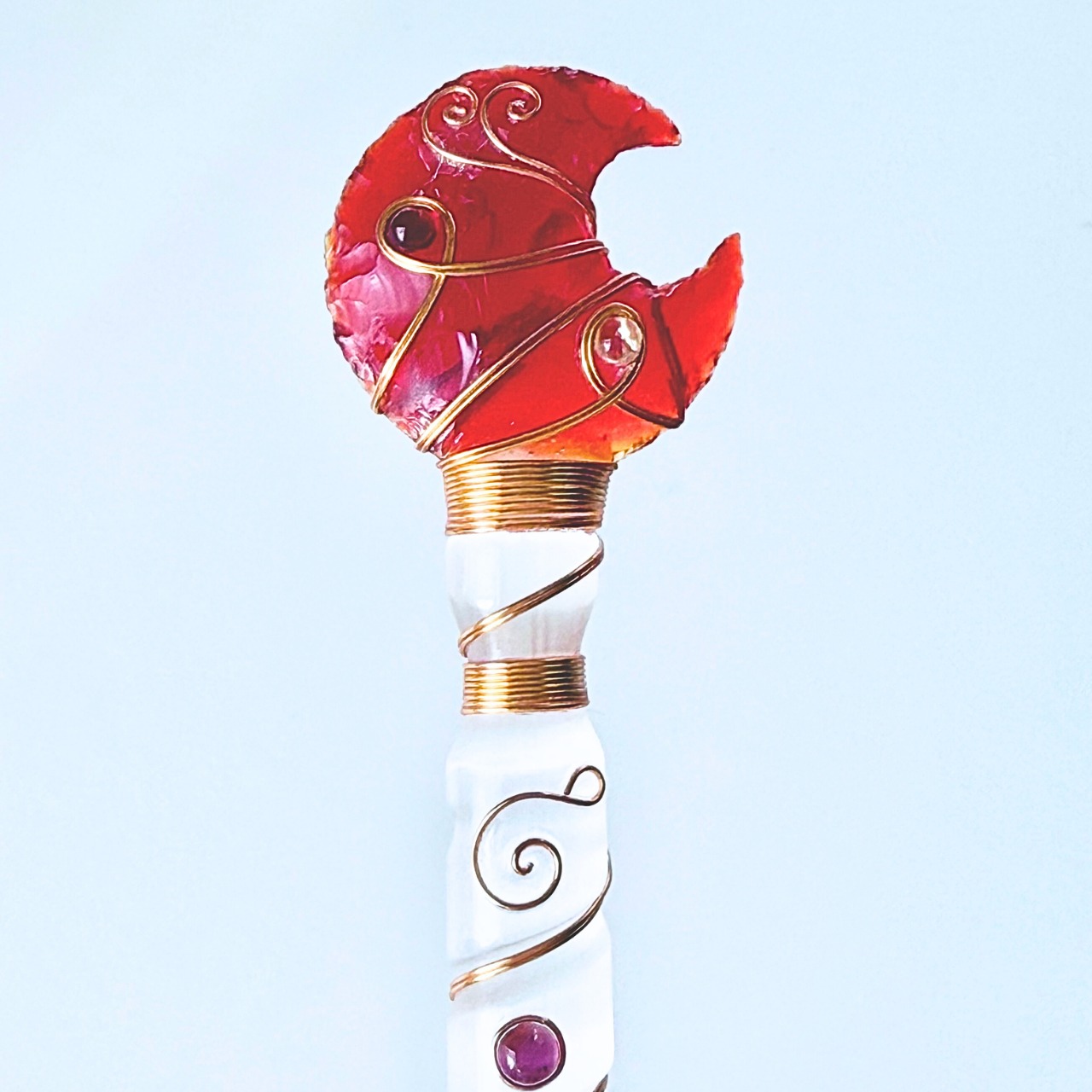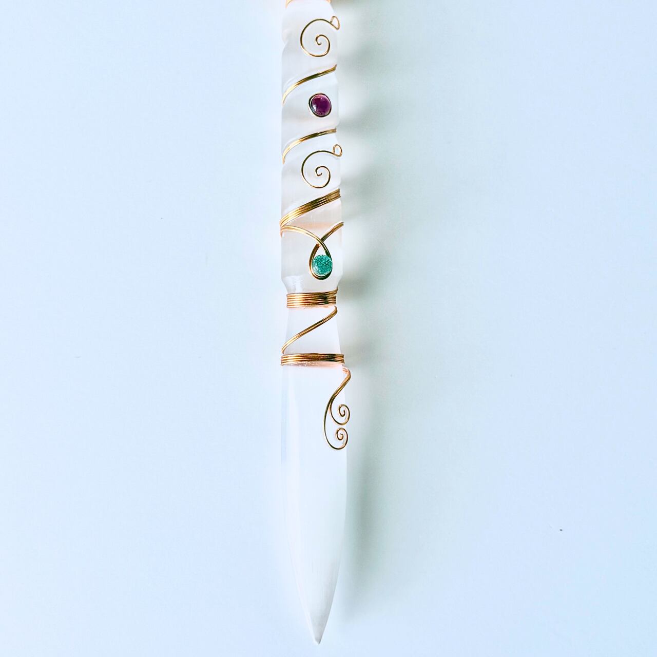 セレナイトとレッドカーネリアンの波動が交錯することで、心に活力と安定感をもたらします。このワンドは、あなたが直感を信じ、自分を表現するためのパートナーとして輝きます。
