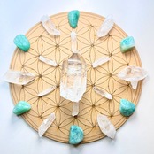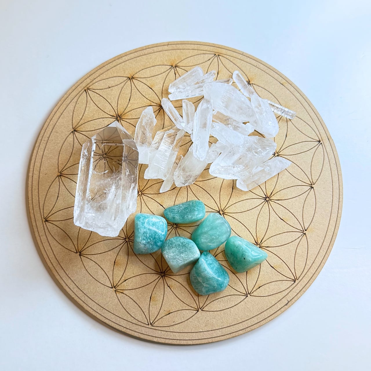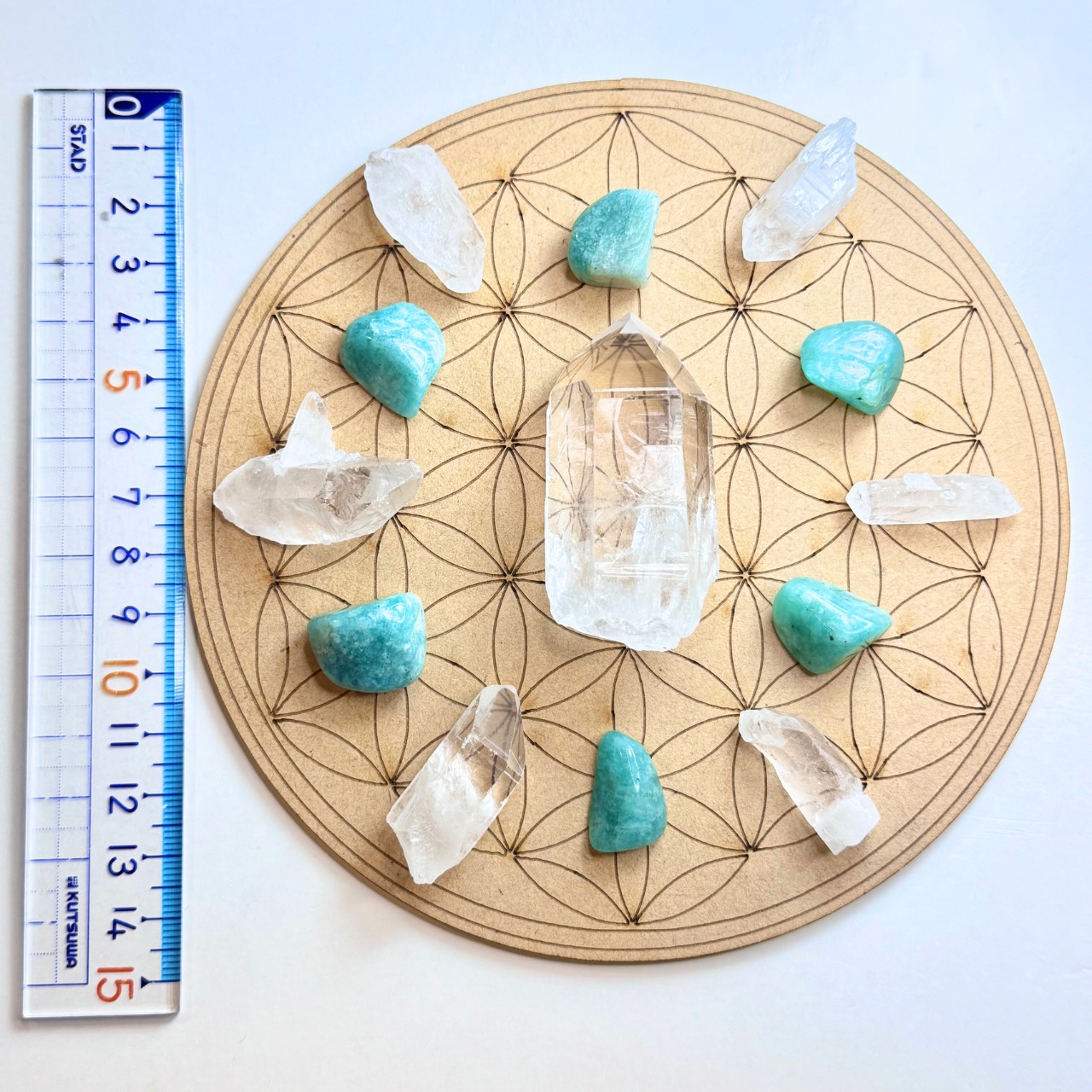 フラワーオブライフの木製プレートに中央にはブラジル産の透明度の高い水晶ポイントと周囲にアマゾナイトタンブル、ミニ水晶ポイントを配置しました