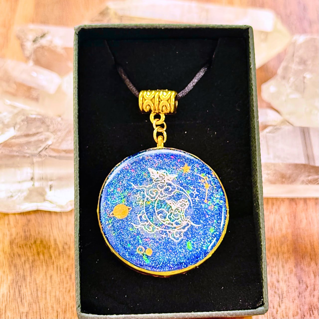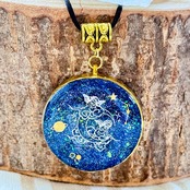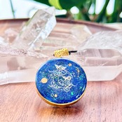 両面で異なるシンボルが輝く、エネルギーアートのようなオルゴナイトペンダントです