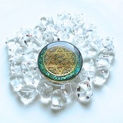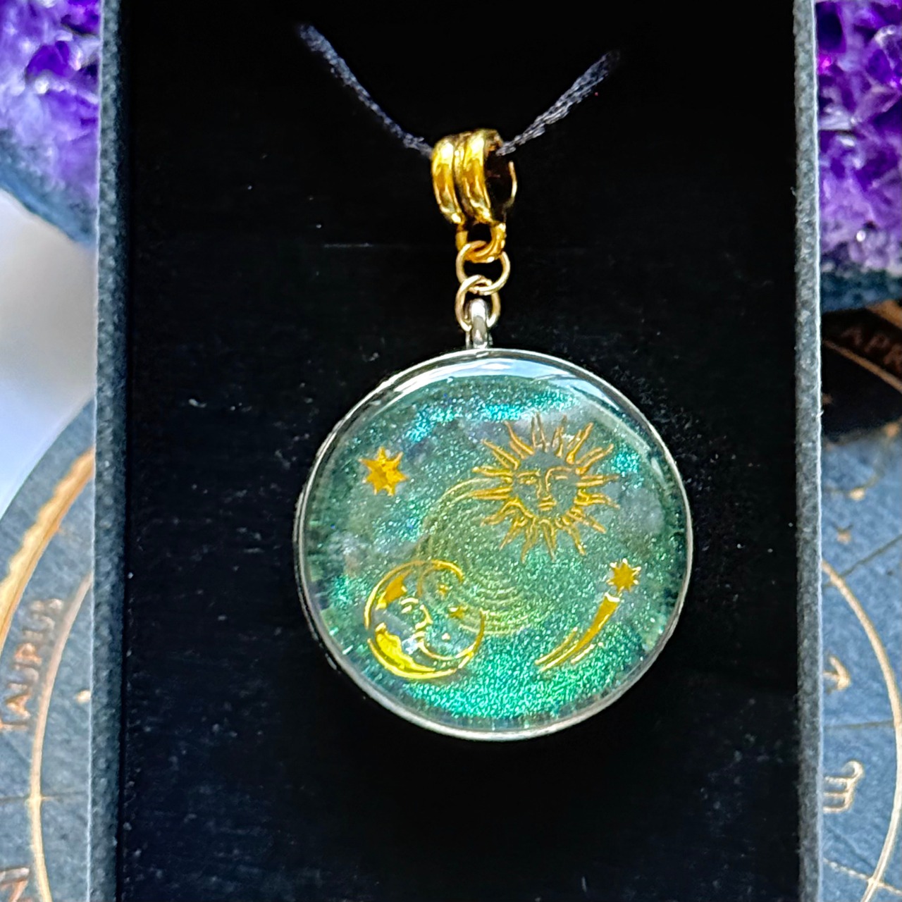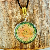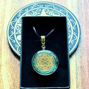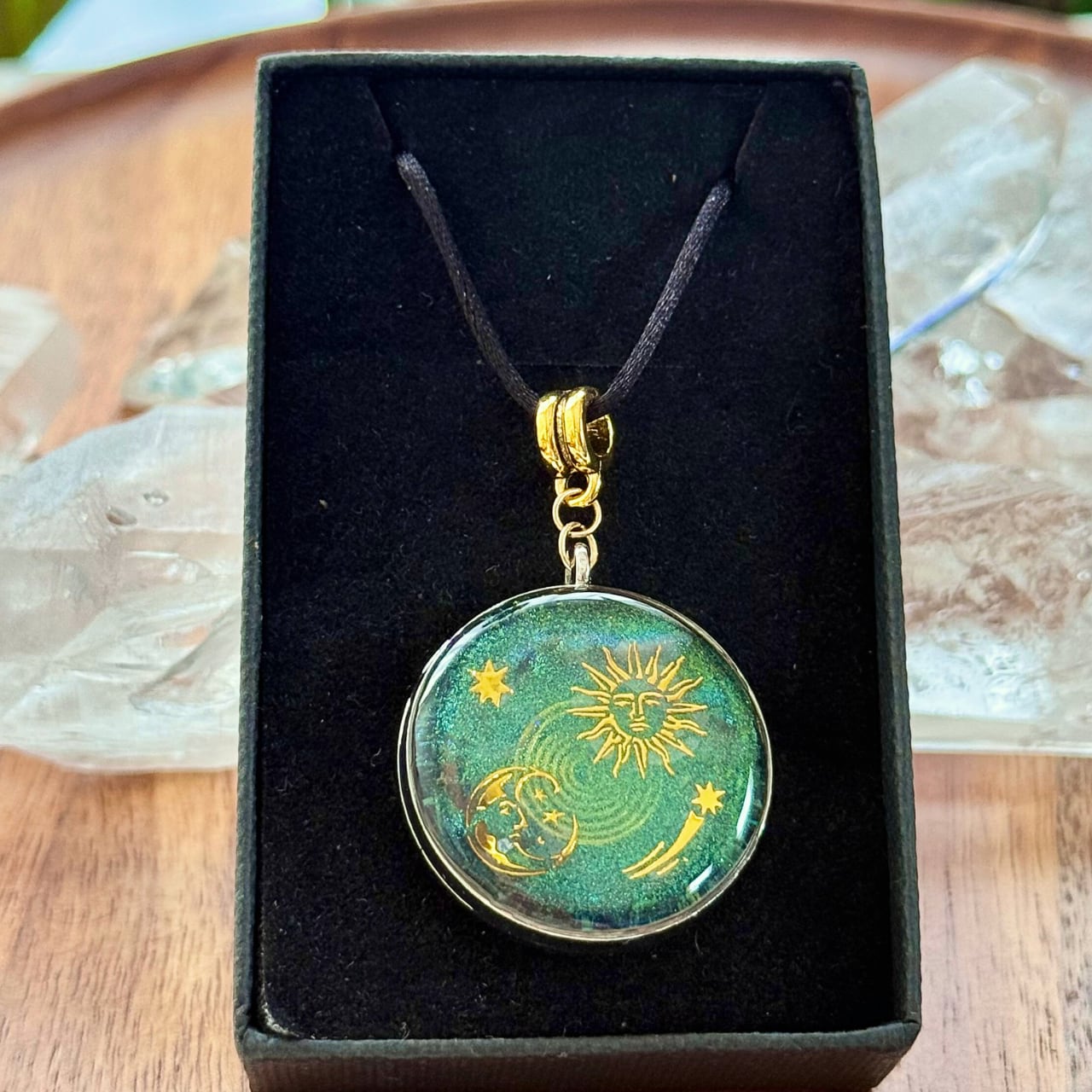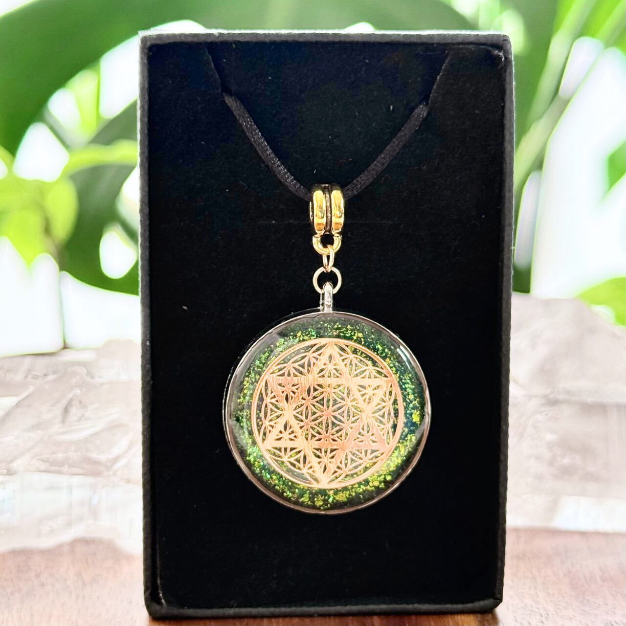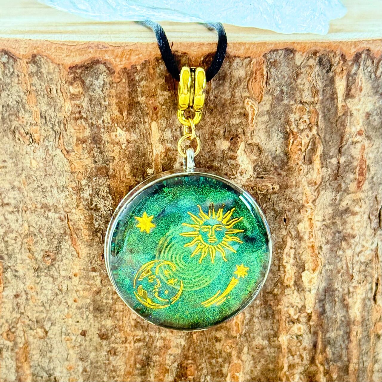 両面で異なるシンボルが輝く、エネルギーアートのようなオルゴナイトペンダントです