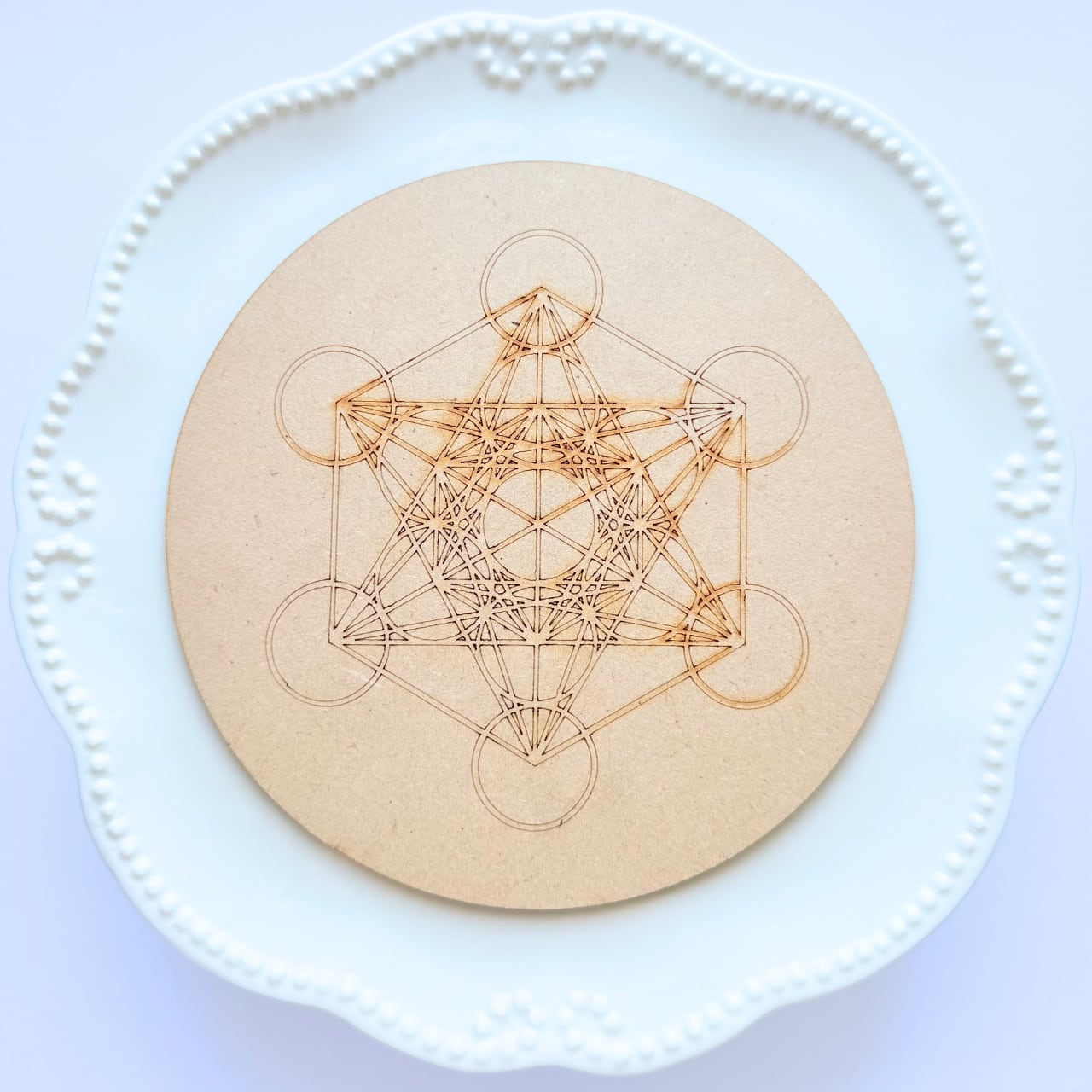 神聖幾何学「メタトロンキューブ」のプレートに、中央にはゼッカ産の美しい水晶クラスターを配置しました