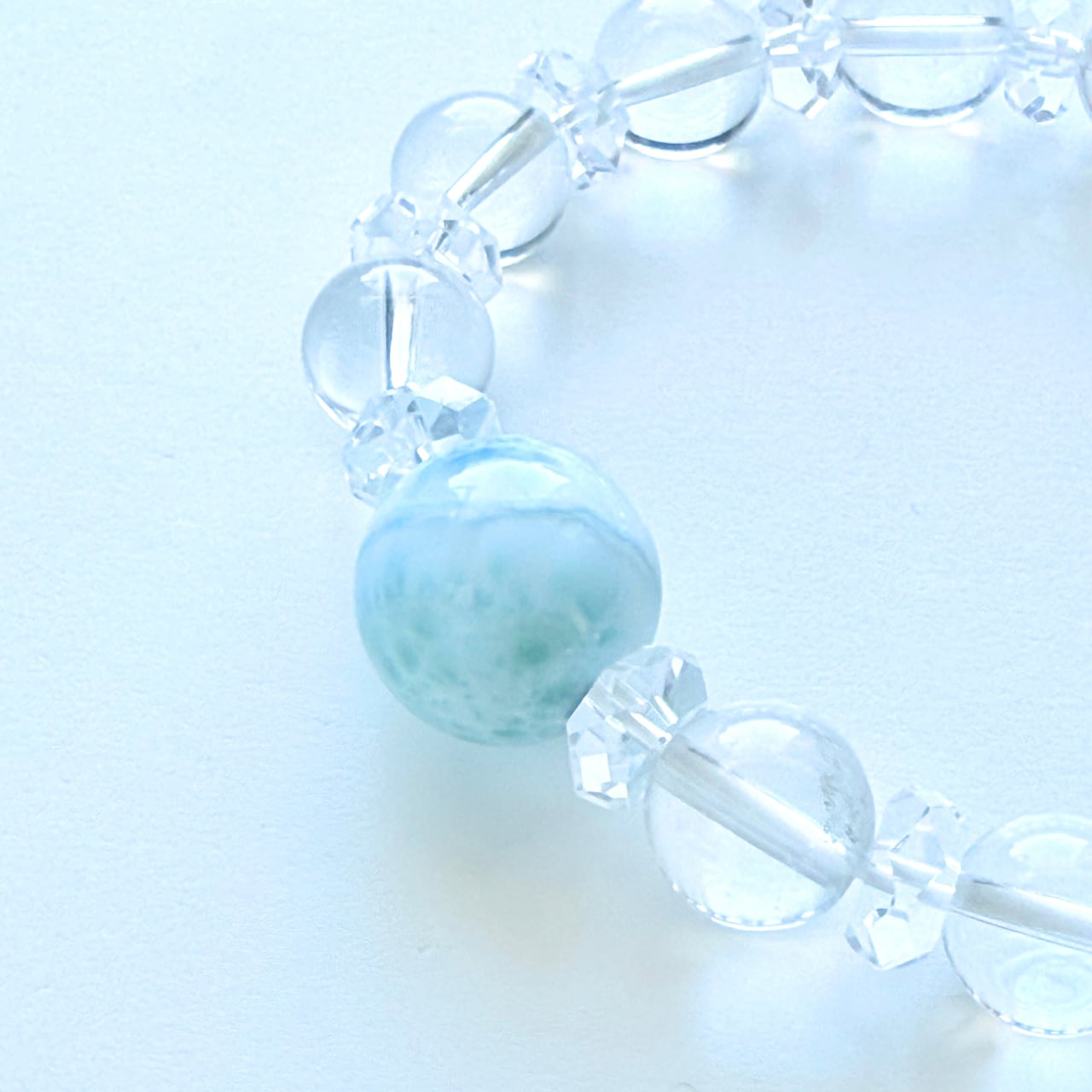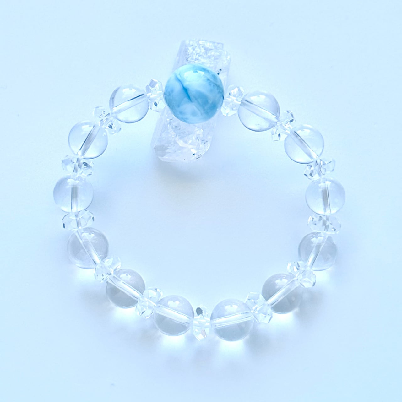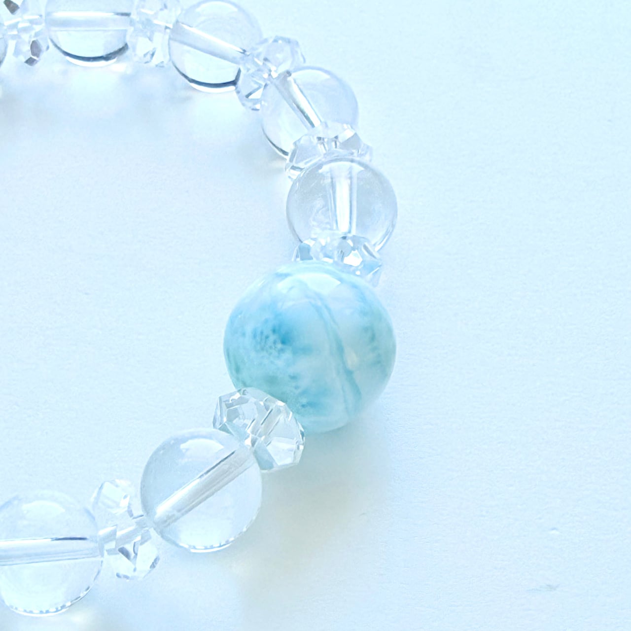 中央に大粒のラリマーを配し、水晶とカット水晶を組み合わせて仕立てた